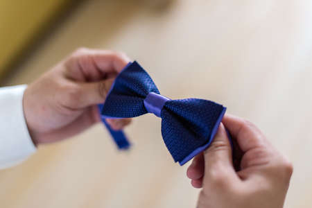 Blue bow tie in the hands of the groom. Bow tie in the hands of a man