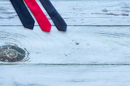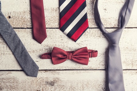 Fathers day composition of colorful ties and bow tie laid on wooden floor backround.