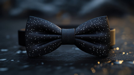 A striking black bow tie rests against a dark, blurred background that features soft, round shapes, enhancing its elegance. This setup emphasizes the sophisticated appeal of the accessory, ideal for formal attire.