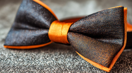 A sophisticated accessory featuring a sleek black and vibrant orange silk, artistically knotted atop a richly textured background, perfect for refined occasions.