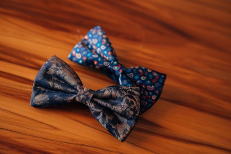 elegant colored bow ties lie on a wooden brown shelf in warm colors