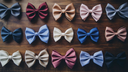 A collection of elegant bows in various sizes and colors, arranged artistically on a wooden table, perfect for crafting.