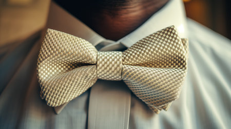 Detail shot of a stylish and elegant golden bow tie on a crisp white shirt, symbolizing formal attire and sophistication.