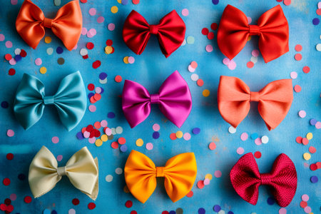 Brightly colored bows arranged with scattered confetti on a blue surface, symbolizing celebration, party, and gifting