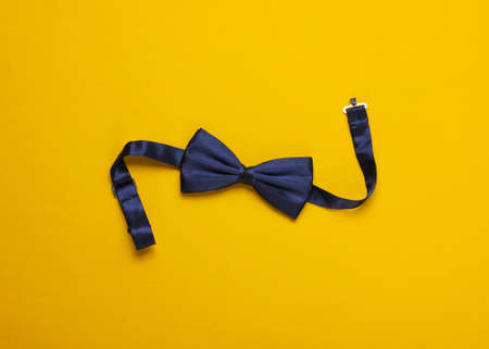 This image features a sleek black bow tie placed against a bright yellow background, ideal for showcasing fashion inspiration and formal event styling.