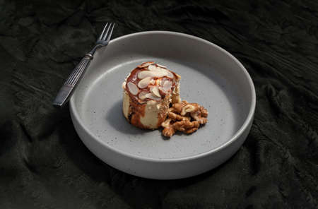Thai milk tea Almond Minibon and Walnuts served with Metal fork on ceramic plate with dark background. Copy space, Selective focus.