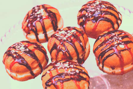 donuts topped with jam on a glass plate, note shallow depth of field