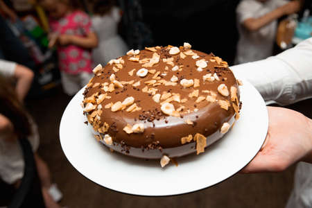 round chocolate cake with nuts on a white plate