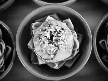 Thai traditional folded white and pink lotus in small green ceramic bowls for paying homage to hindu gods