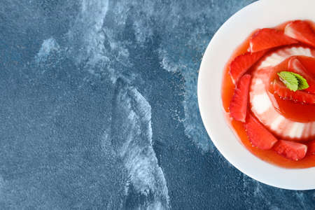 Plate with tasty homemade strawberry panna cotta and mint on color background