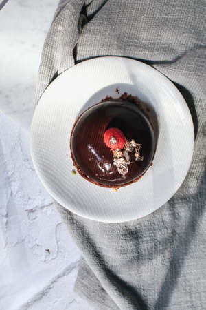 Chocolate Mousse Cake and topped with Raspberries and pink rose on a light background. Vintage and luxury.