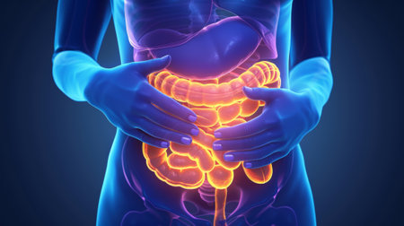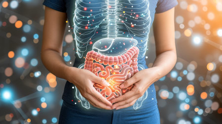 A person holds a glowing holographic representation of human intestines, symbolizing concepts of digestive health, gut microbiome, and medical innovation. The image highlights the importance of internal organ well-being and advanced healthcare.