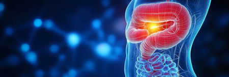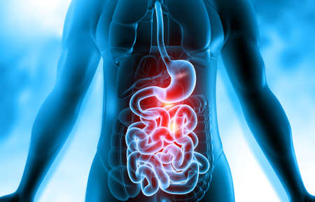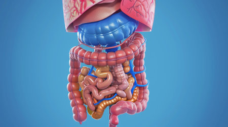3D Illustration of Human Digestive System Anatomy with Highlighted Intestines on Blue Background
