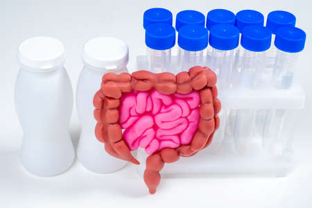 Gastrointestinal tract. Probiotics and prebiotics. Prevention of dysbacteriosis. A mock-up of the human intestine next to bottles of useful drink.