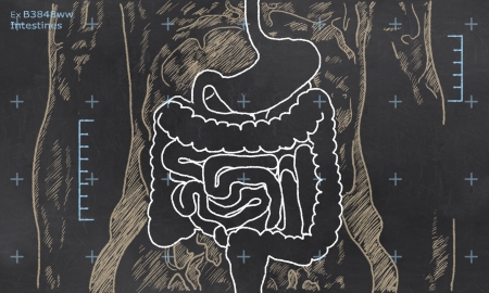 A vibrant image of a human digestive system illustration, showing the entire digestive tract from the mouth to the intestines, with clear, labeled parts.