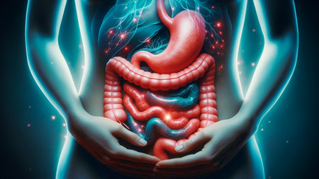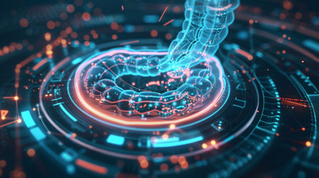 AI generated digital rendering of human intestines glowing with bioluminescent particles on a dark bokeh background showcasing futuristic medical technology