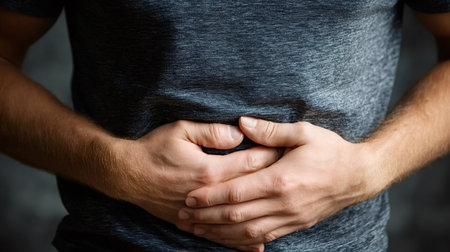 Man clutching his abdomen with both hands, grimacing from stomach pain and discomfort, suggesting indigestion, cramps, bloating or other digestive illness