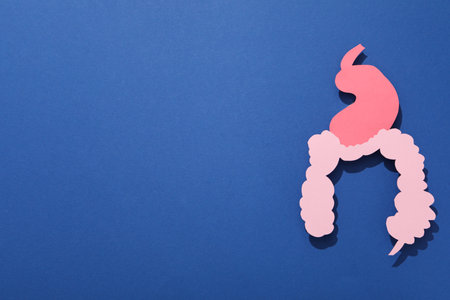 Close-up of hand holding a colon symbol and touching stomach painful suffering from stomachache causes of gastric ulcer, appendicitis, or gastrointestinal system disease. Space for text