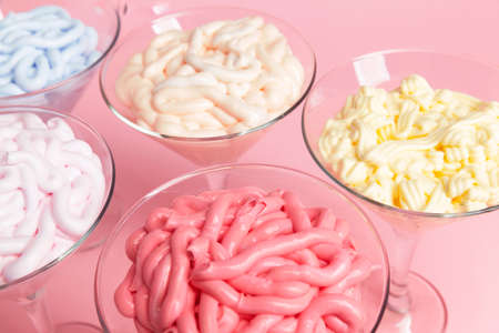 multicolored emulsions for cosmetic creams in glass on rose background, close up