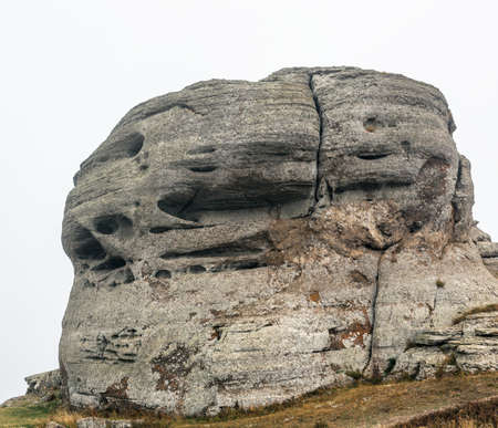 Gray rocky outliers at the top of the mountain in fog on an autumn day