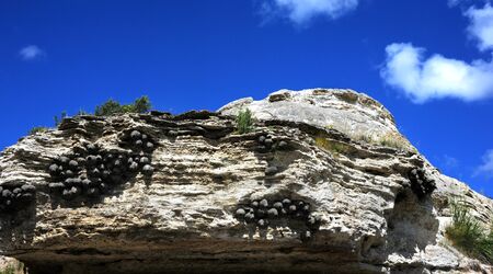 Colony of American Cliff Swallows nest on the side of Soda Butte, a dormant hot springs, in Yellowstone National Park. Butte is in Lamar Valley.