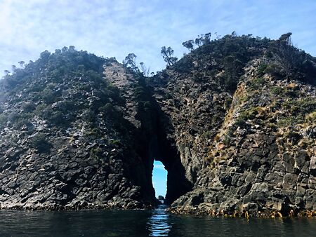 A rocky cliff with a large archway in the middle. The archway is surrounded by a large body of water