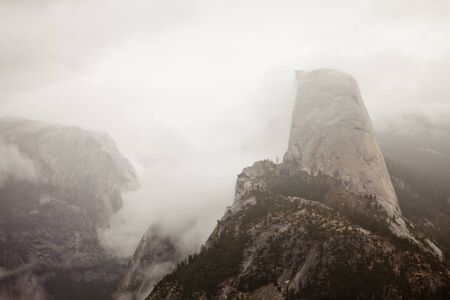 Half Dome peeking through the clouds as seen from Washburn Point in Yosemite National Park, California.