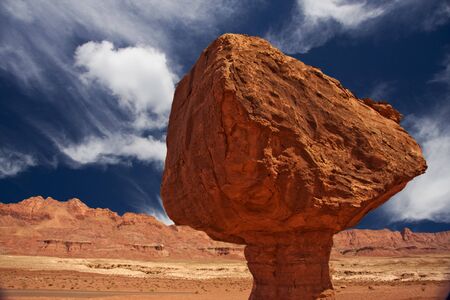 Rock in the middle of the desert with blue sky and white clouds