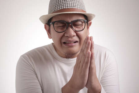 man praying to god with hands together on grey background stock photo