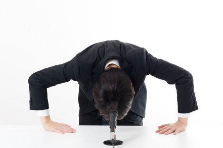 A woman in a black suit is bowing in a sign of respect against a white background. The woman has dark hair.