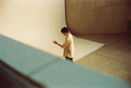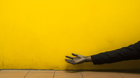 A hand reaching out towards a yellow wall in a well-lit indoor space during the day