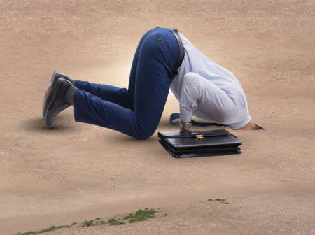 The businessman hiding his head in sand escaping from problems