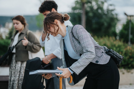 Young professionals reviewing documents outdoors during a business meeting