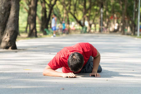 Young men wearing red shirts falling down to the pavement in public park while jogging. Concept injury from exercise.