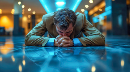 A businessman in a suit lying on a reflective floor in a modern corporate hallway, holding his head in his hands, symbolizing business failure, stress, and emotional struggle.