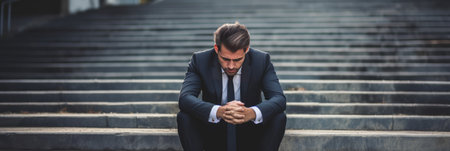 Close-up portrait of business man in depression sitting on the stairs outdoor. Work stress concept.