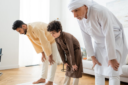 Interracial men and muslim boy bending while praying at home