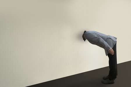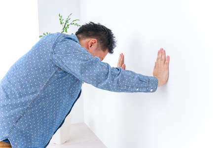Sad man in his 30s feeling dizzy and trying to balance against a wall background. Sick man with vertigo illness
