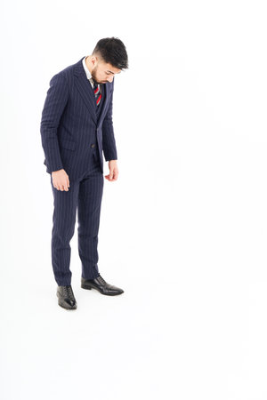 Businessman looking at the bottom of the screen and white background