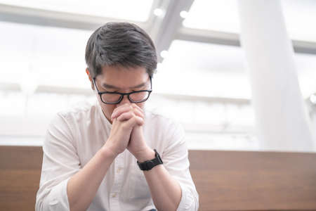An Asian man praying on a bench in a Christian church.
