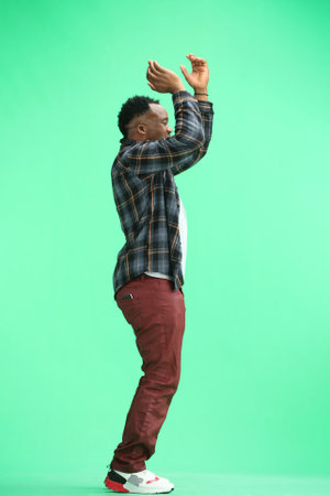 A man, full-length, on a green background, rejoices