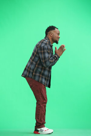 A man, full-length, on a green background, pleads
