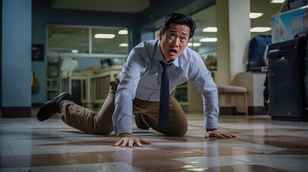 Capture the urgency of health crises! An Asian man faints on the floor, symbolizing vulnerability.