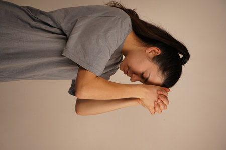 The pose reflects a moment of spiritual connection. The subtle expression enhances the feeling of faith and hope. The hands are clasped together in a gesture of prayer, radiating a sense of reverence.