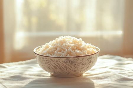 A steaming bowl of white rice sits on a soft linen background, casting gentle shadows. This image captures simplicity and warmth in food presentation.