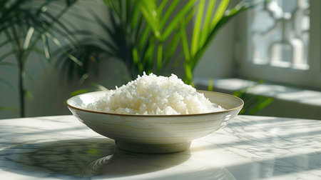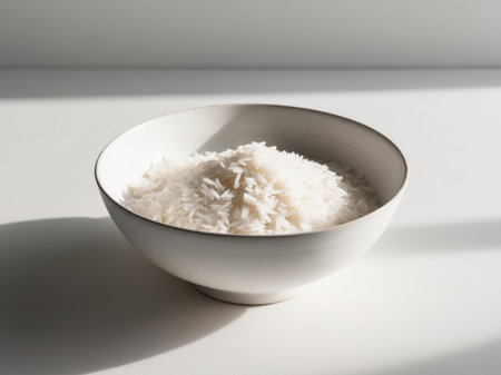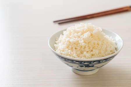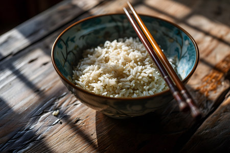 Steamed white rice in ceramic bowl with wooden chopsticks, simple comforting meal ready to eat and evoke homely warmth