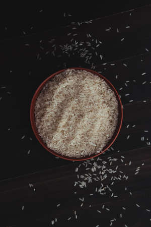 Porcelain pan with raw white rice on black background. White rice. Human food. Cereals rich in starch and source of nutrients. Culinary delicacy.