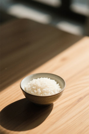 A serene image featuring a bowl of white rice and a cup of tea on a rustic wooden table, highlighting simplicity and comfort in dining. Perfect for food enthusiasts.