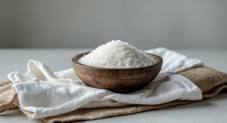 AI Generated. A Wooden Bowl filled with White Rice on a Burlap Sack and Cotton Cloth