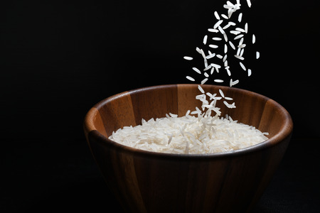 Thai Jasmine rice in bowl on wooden table, selective focus